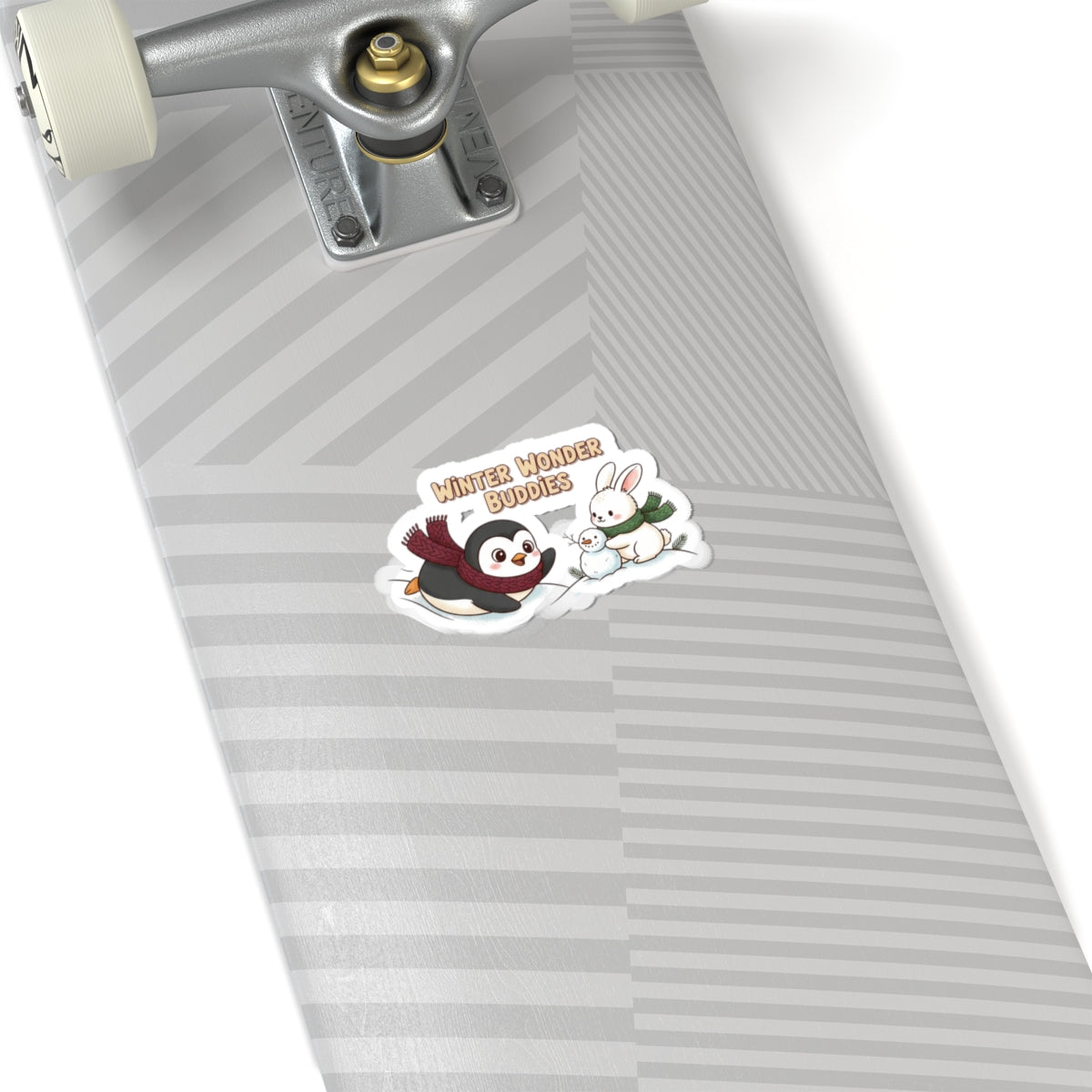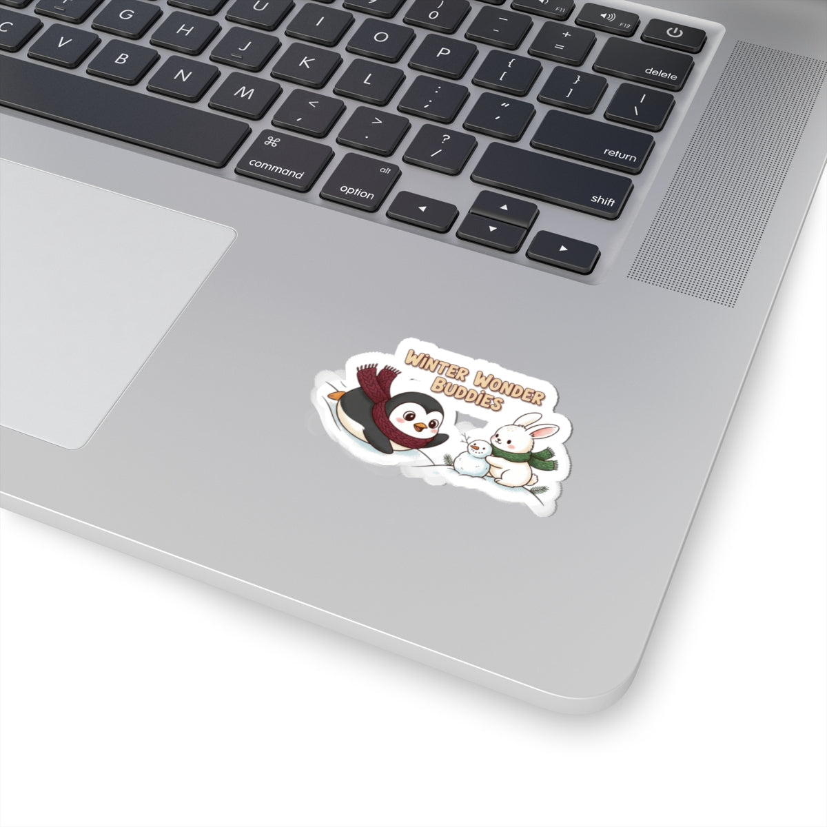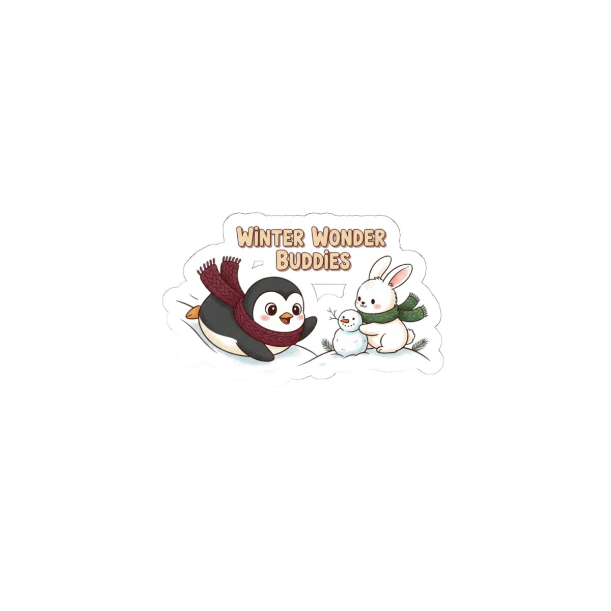 Sweet winter woodland sticker featuring a playful penguin and a cozy bunny building a tiny snow friend. Soft, rounded illustration and a winter palette of pine-green and burgundy accents give this design a tender, family-friendly feel that aligns with whimsical winter animal searches. The compact kiss-cut format works well on laptops, journals, and smooth indoor surfaces for seasonal decoration and everyday charm. Product features - Glossy paper finish: Scratch-resistant surface - Long lasting: Vinyl surface with permanent acrylic adhesive for smooth flat surfaces - Vibrant colors: Printed with eco-solvent inks for bright color - PNG format: Kiss-cut stickers require a transparent PNG design file - Choose between 4 sizes with a glossy finish Care instructions - Use a soft, clean and dry cloth to gently brush any dust or dirt off from the center of the sticker outwards.