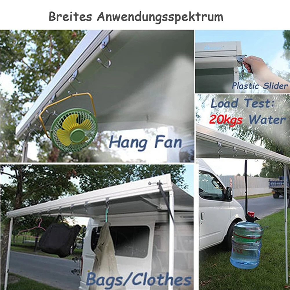 Easy to use: The awning camping accessory hooks can be easily installed and removed through the hole in the hook holder. You can hang them directly anywhere that can automatically slide into the awning roller channels of the RV sunshade, and you can also hang something on the hooks directly without taking up a lot of time